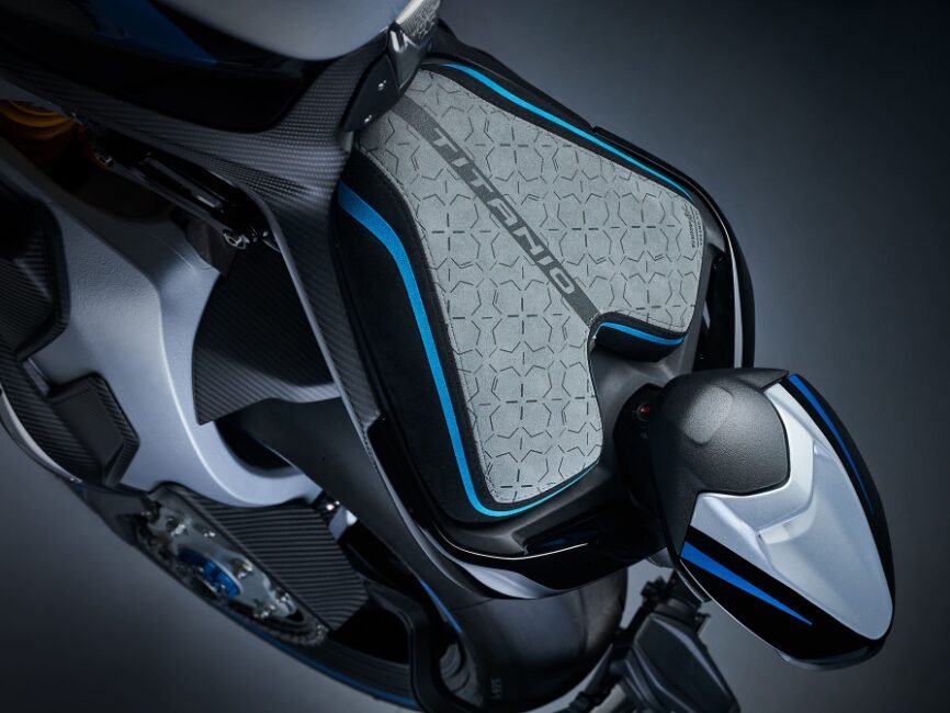La Rush Titanio mantiene la esencia estética de la familia Rush, con un diseño audaz e inconfundible. Su esquema de color “Nero Intenso” combinado con detalles en “Blu Titanio” y “Argento Magnum” resalta su carácter exclusivo. Además, incorpora elementos inspirados en la estructura atómica del titanio, convirtiendo cada detalle en una declaración de diseño que fusiona arte, ingeniería y personalidad.