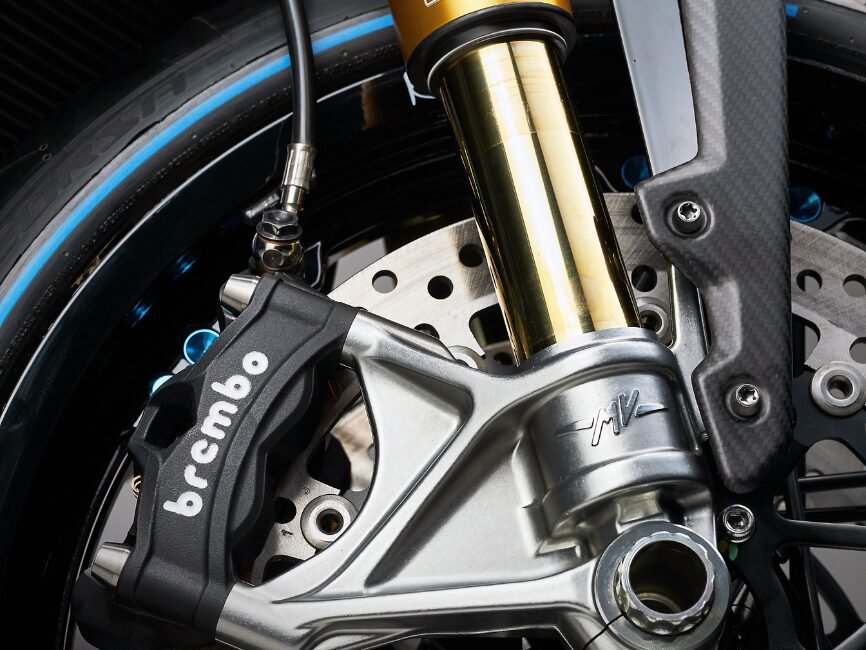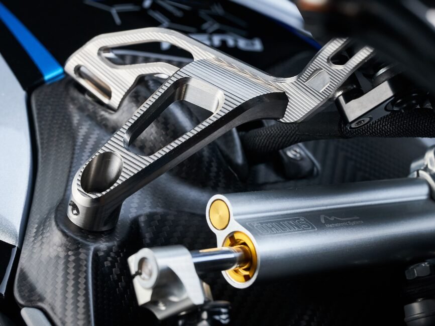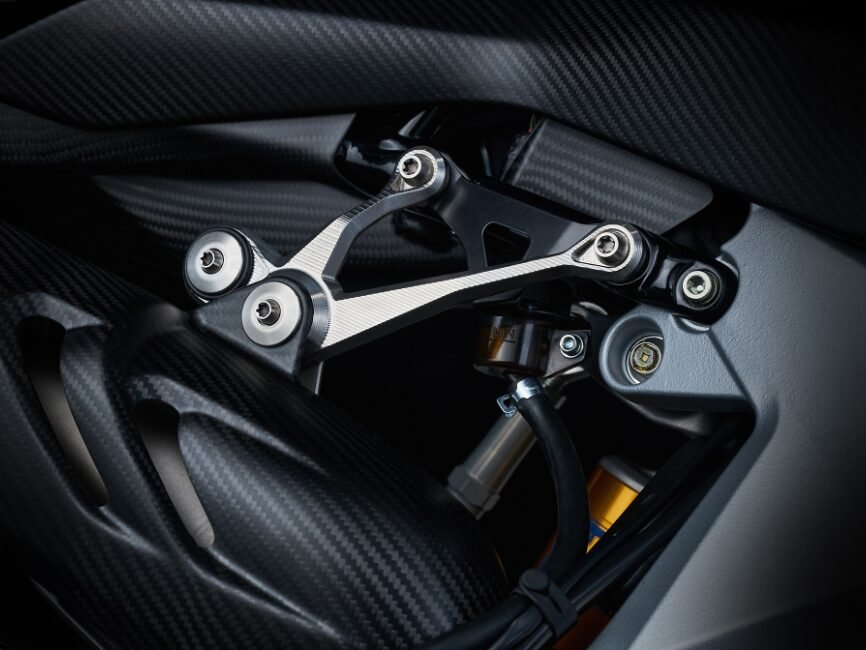 El uso extensivo de titanio es uno de los elementos distintivos de esta edición, presente en componentes clave como el sistema de escape, soportes estructurales y detalles del chasis. A esto se suma una cuidada integración de fibra de carbono con acabado twill y elementos de aluminio anodizado, creando una estética sofisticada y agresiva. Esta combinación no solo mejora el rendimiento al reducir el peso, sino que también refuerza su identidad visual como una motocicleta de alto nivel tecnológico.
